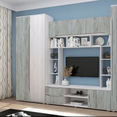 - Гостиная включает себя платяной шкаф, нишу под ТВ и пенал с полками