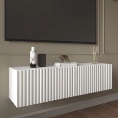 Благодаря своей компактности тумба под ТВ подвесная поможет сэкономить пространство, избежать ощущения загромождённости гостиной, спальни или детской комнаты, а рифлёный фасад будет акцентировать